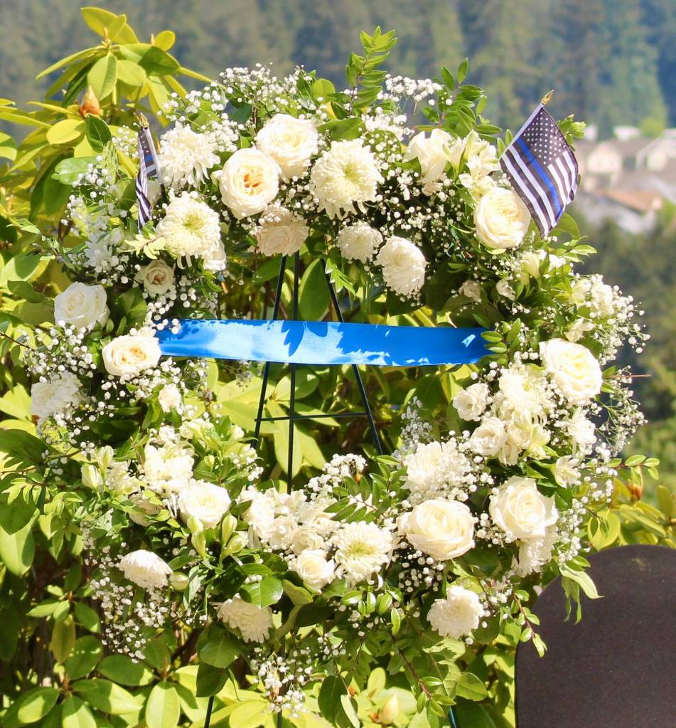 A wreath bearing a single blue stripe is dedicated to the fallen law enforcement officers throughout Kitsap County.
