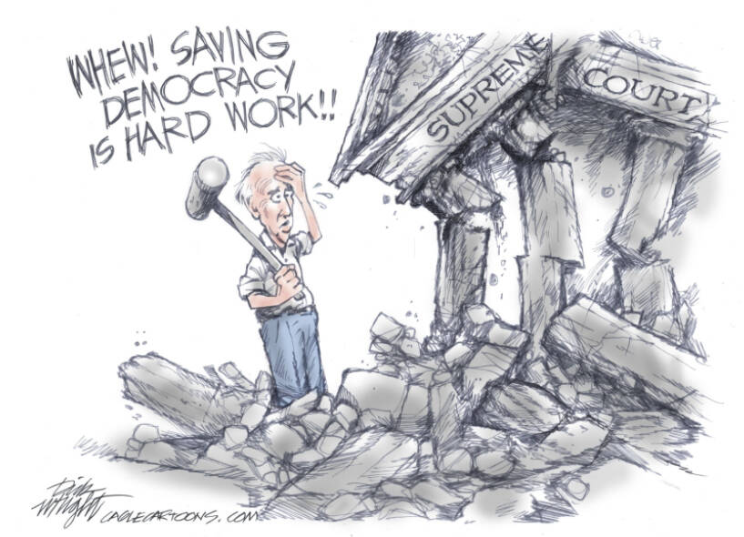 His proposals— another election-time pander to his party’s progressive base— were liberal, pie-in-the-sky ideas that everyone knows will never materialize in the real world. They included getting Congress to impose term limits and a binding code of ethics on justices, neither of which could get the required votes in a divided Congress.