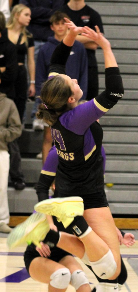 NK senior Teegan DeVries goes up for a two-handed attack at the net.