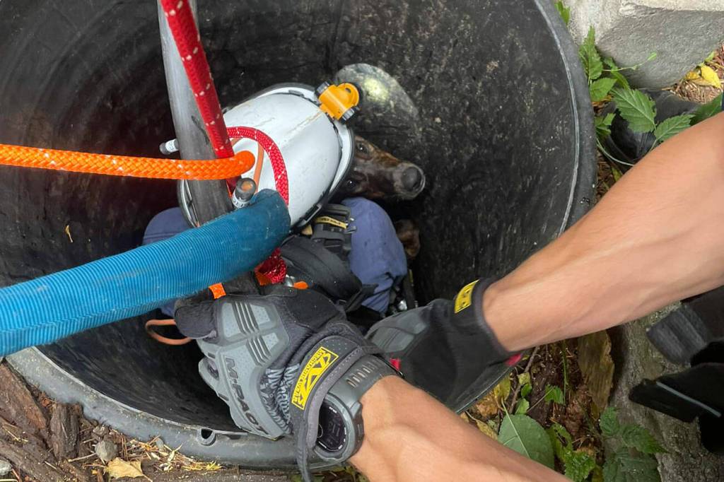 North Kitsap Fire & Rescue crews were dispatched to a Suquamish Way address when people at the scene called for help. Firefighters found the dog balanced on a bucket about 30 feet below ground level in water that was estimated to be 20 feet deep, per NKF&R. The well’s opening was about 3 feet in diameter.