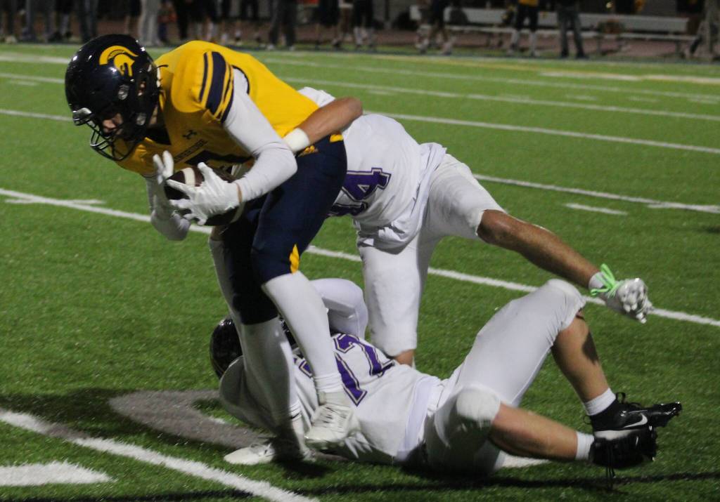Bainbridge senior Isaiah Beyer is brought down by a pair of North Kitsap defenders.