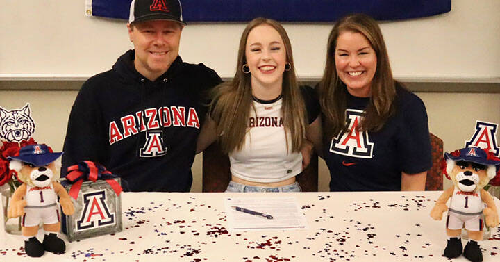 Kingston senior Delaney Mead, middle, signed her letter of intent to attend the University of Arizona Nov. 13 at Kingston High School. Joining her was dad Cory and mom Shannon.