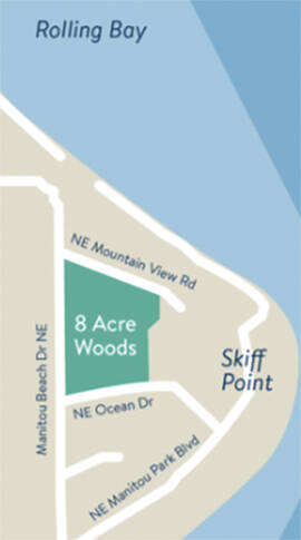 8 Acre Woods is located at the corner of Manitou Beach Drive and Mountain View Road at Skiff Point. It shares a property line with the Fieldstone of Bainbridge, a senior living center. The property owner is a longtime supporter of the foundation and was aware of the organization’s effort to bring opportunities to the areas of the BI underserved by parks and trails.