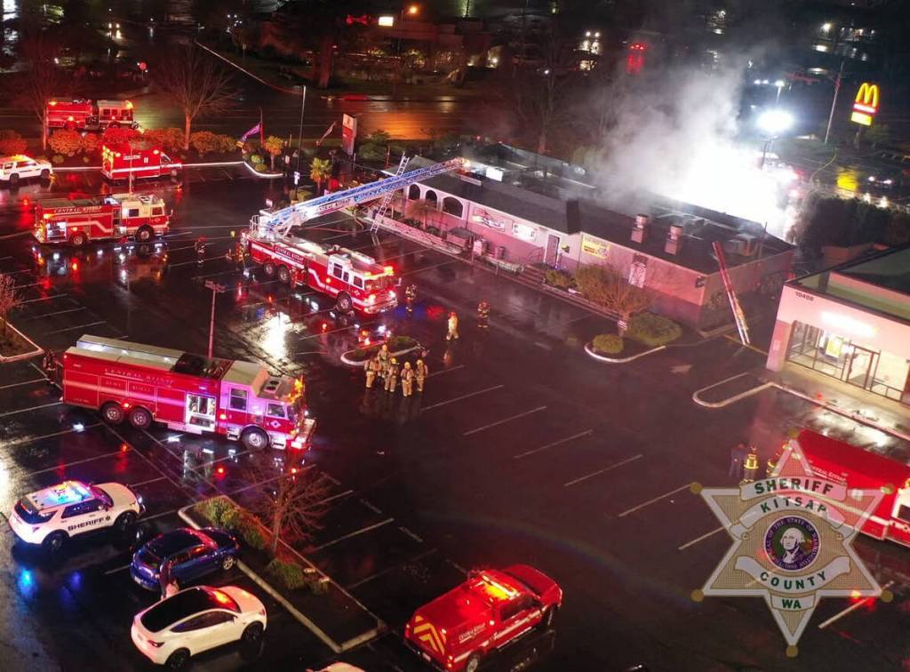 The Kitsap County Sheriff’s Office reported that both northbound lanes of Silverdale Way in the 10400 block were blocked as crews worked to extinguish the flames. Authorities urged the public to avoid the area until further notice.