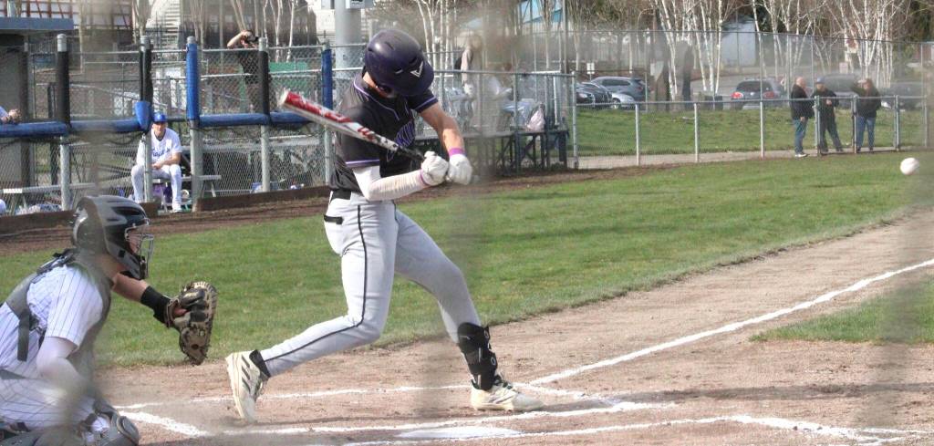 Viking Spencer Gillespie swings at a pitch in a 13-6 North Kitsap win over the Olympic Trojans March 26 at the Kitsap County Fairgrounds.