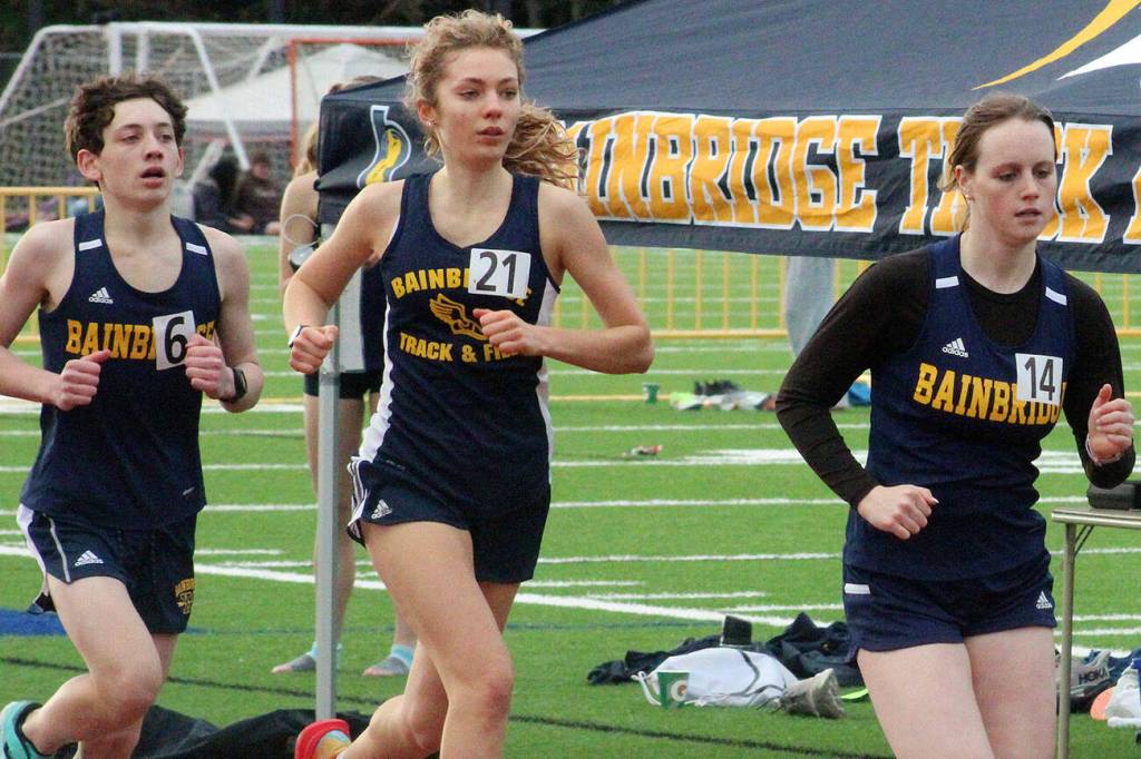Bainbridge track athletes Mairin O’Brien (front), Nova Sheppard, and Michael Sanders compete in a meet against North Kitsap March 24 at Bainbridge High School.