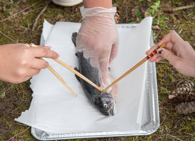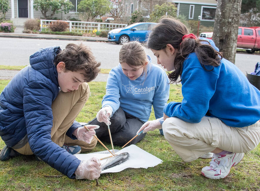 Timoteo Butler, left, Indie Becker, and Sofia Butler of Catalyst Public Schools explore the anatomy of a salmon.