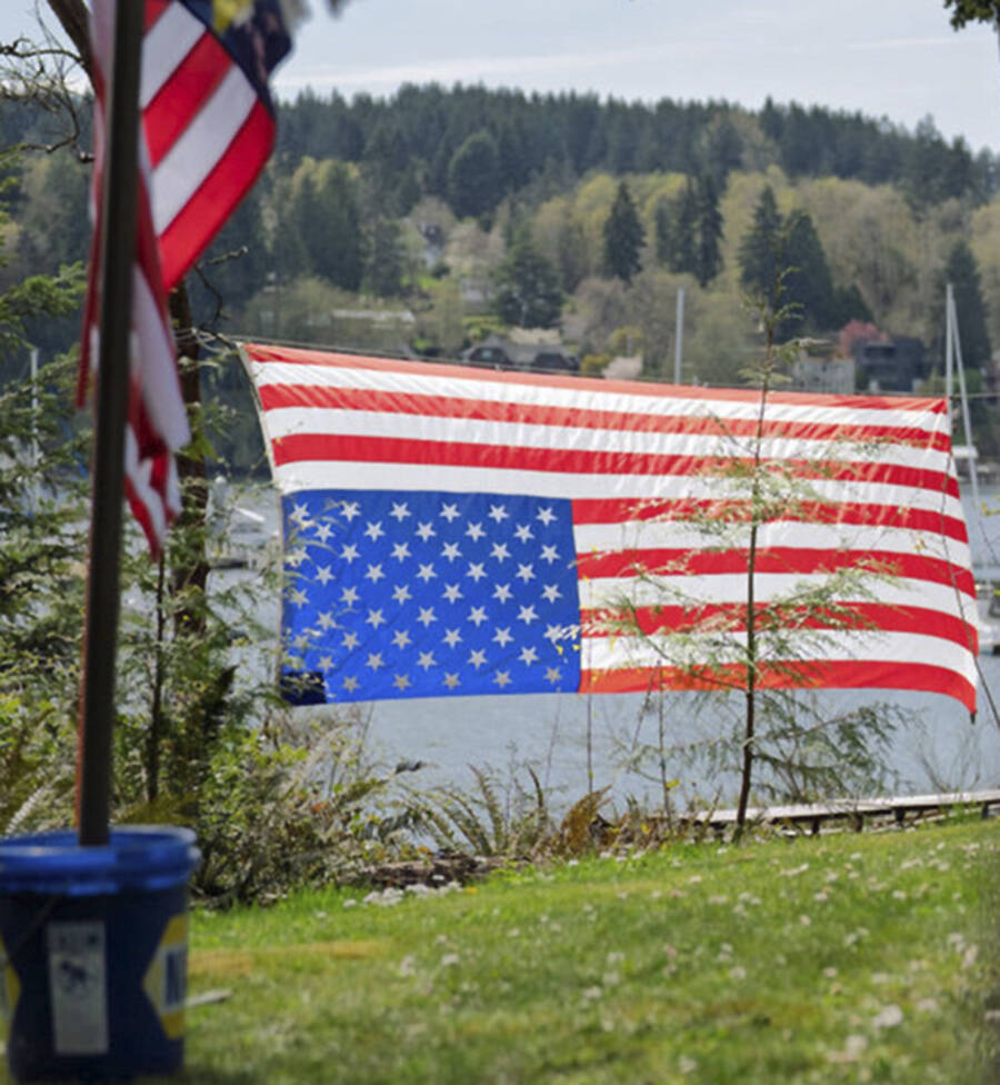 An American flag suspended upside down, the international sign for distress.
