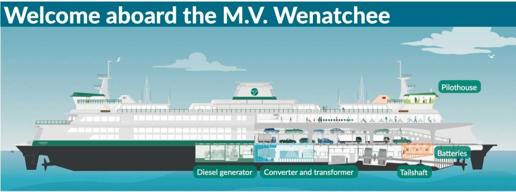Wenatchee’s hybrid-electric operations are estimated to reduce greenhouse gas emissions by 15%. Once WSF completes terminal charging capabilities, Wenatchee will primarily operate using electric power. This will further reduce greenhouse gas emissions by up to 95% compared to before the upgrades, agency spokesperson Dana Warr said.