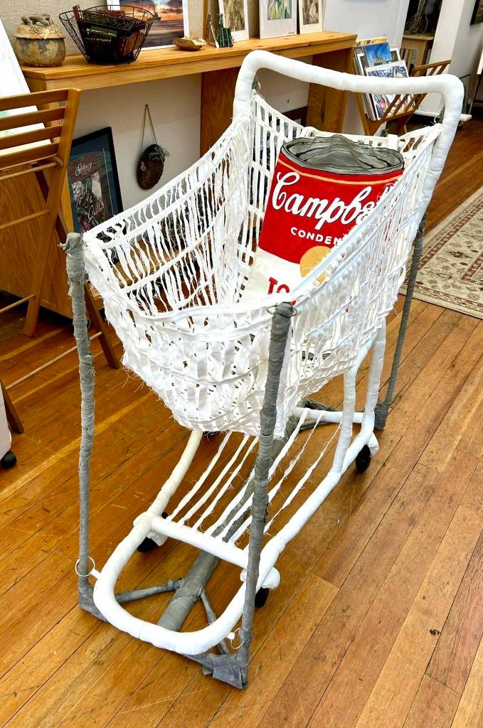 Lewis described the work as a slow build he started in winter and finished for the show. “I got the sewing machine out, went through a lot of spools of thread, and I purposely frayed all the edges,” he said. He said the cart’s cloth came from draperies he found at St. Vincent de Paul and that he welded a baby carriage frame to give the piece structure.
