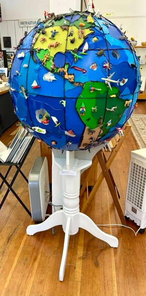 A cloth-wrapped shopping cart, a 12-foot giraffe made from wire frame and plastic, and a spinning globe crowded with action figures is drawing crowds at Port Orchard’s Sidney Art Gallery and Museum.
