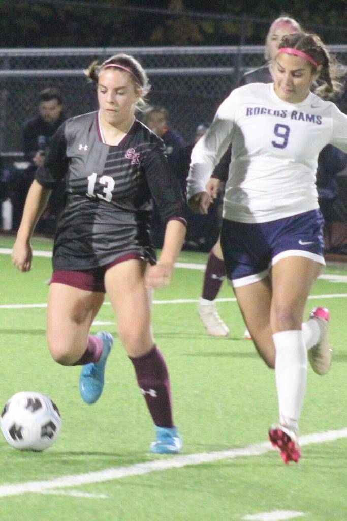 Julia Hoisington of SK dribbles the ball with a Rogers defender in pursuit in a 0-0 draw Oct. 23 in Port Orchard.