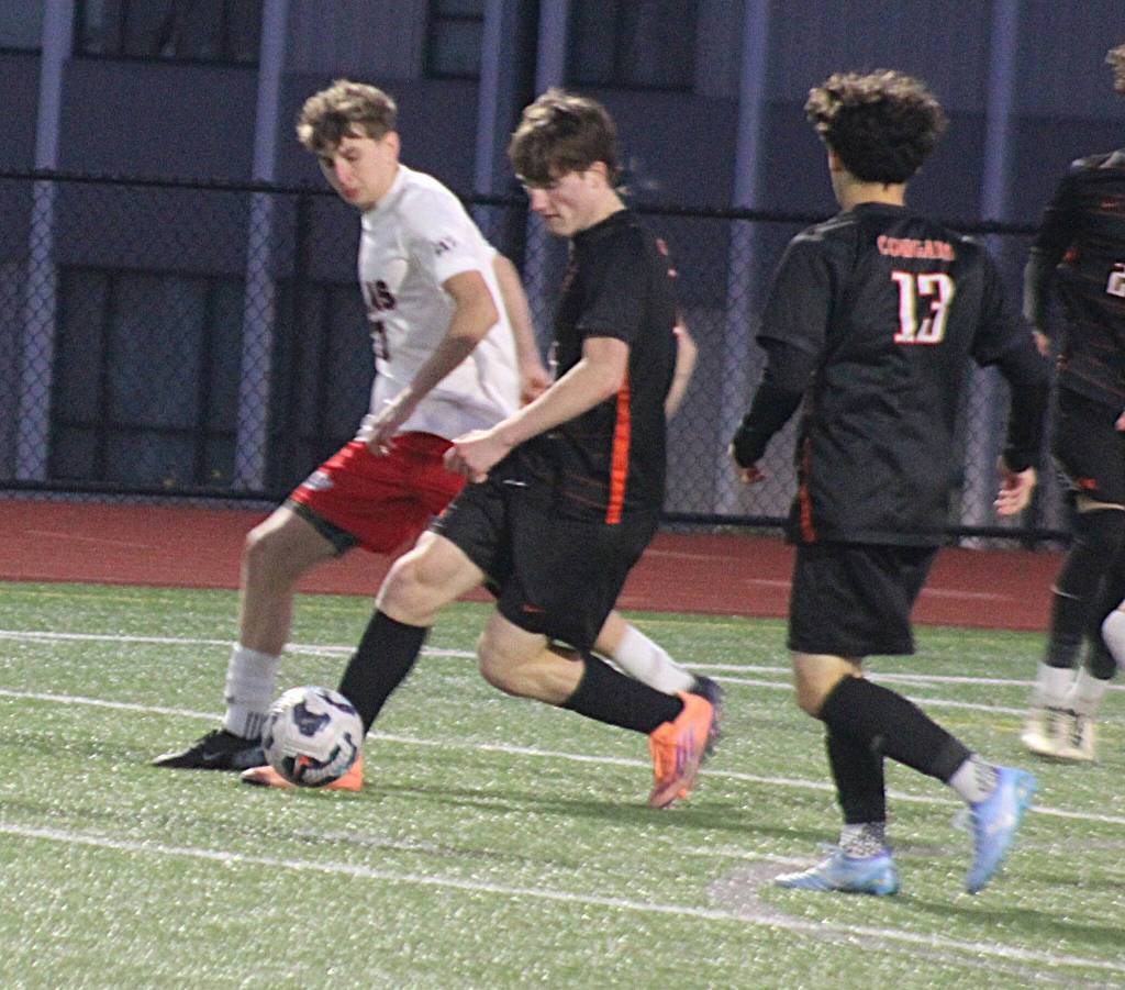 Cougar Wyatt Bell tries to keep the ball away from a defender in a 2-1 CK home loss to Silas Rams April 7.