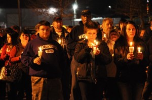 Mourners gathered outside the Christian Life Center in Port Orchard for a candlelight vigil Monday evening honoring slain…