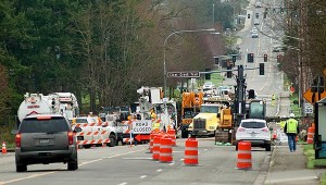 A construction crew works to install power poles on Bucklin Hill Road that will provide the necessary power…