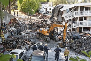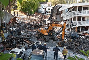 Firefighters watch as an excavator slowly moves through the rubble of the destroyed part of the Bremerton Motel 6 on Aug. 19.