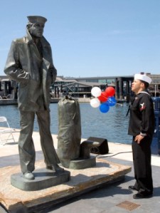 Hundreds of sailors, dignitaries, Navy officials and guests gathered at the Bremerton Marina for a Lone Sailor statue…