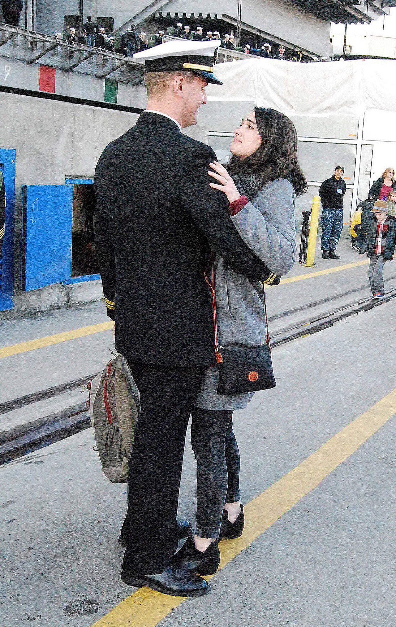 Holly graciously allowed this photographer’s peering lens to watch in (at a respectable distance) as she awaited her new husband’s arrival. When loudspeakers at dockside began playing Meghan Trainor’s Christmas song “I’ll Be Home,” tears began to flow for the new wife, a nurse at Madigan Medical Center — as they undoubtedly did for hundreds of others also awaiting a loved one’s arrival.