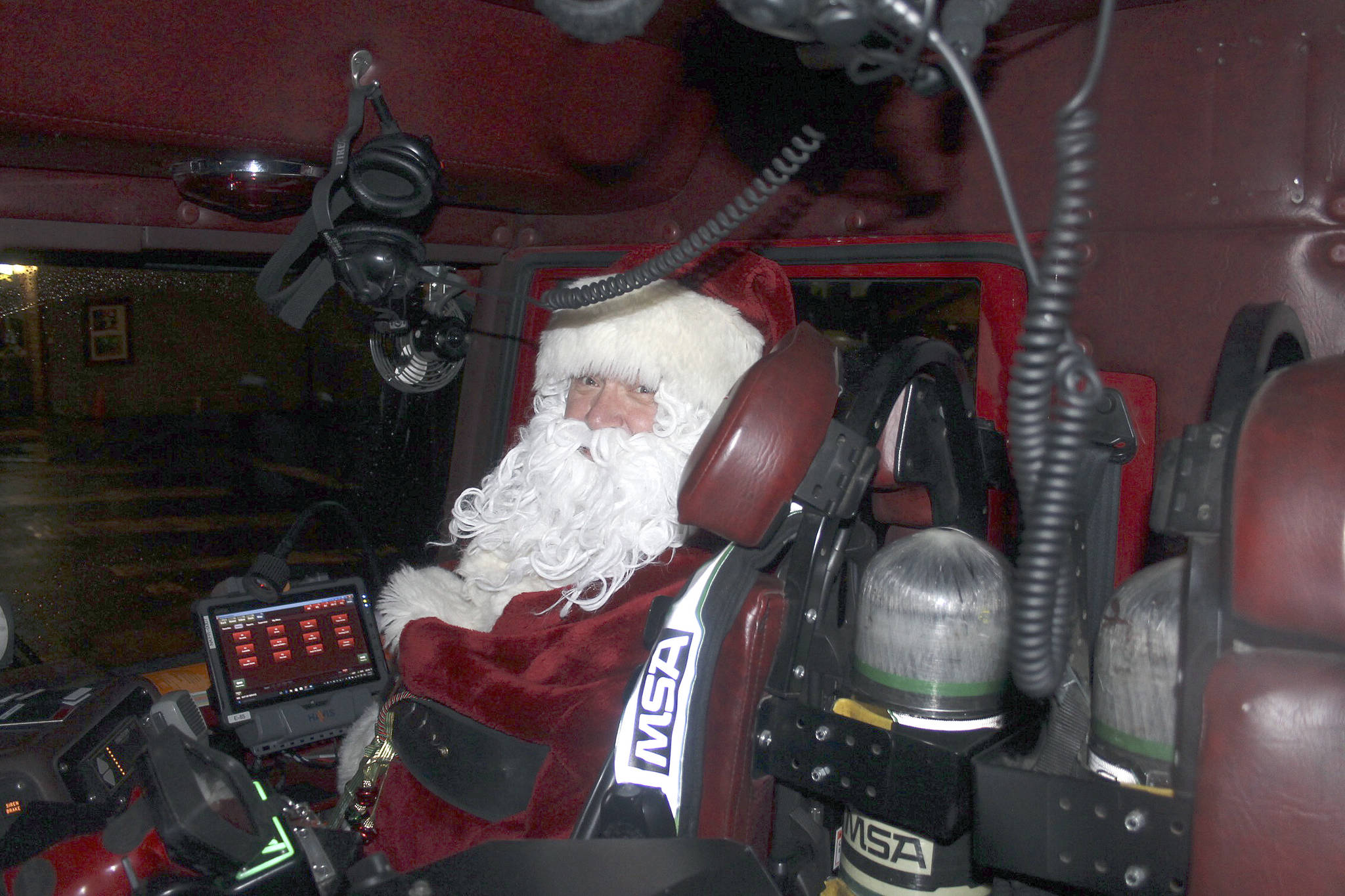 Santa Claus rides shotgun in the firetruck as it approaches Kingston’s Mike Wallace Park. Nick Twietmeyer | Kitsap News Group.