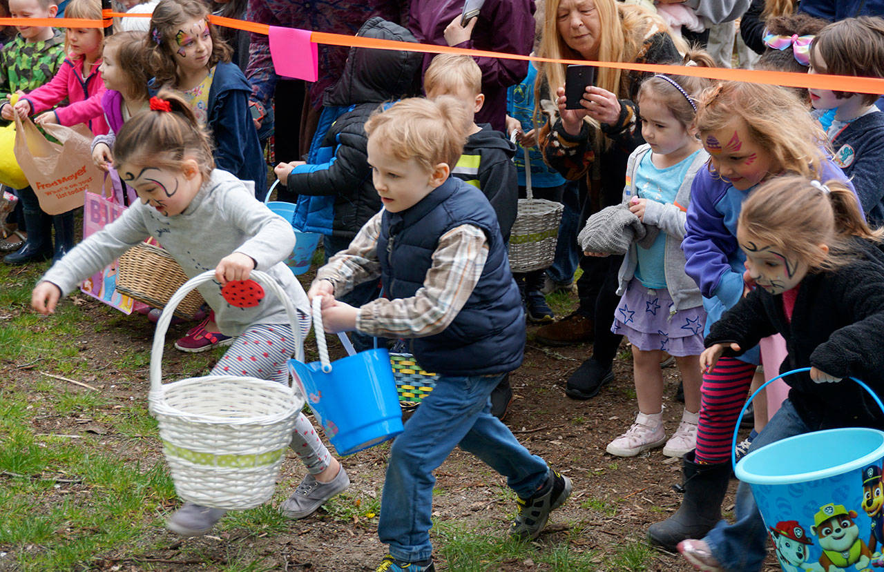 The tape dropped and off went the inveterate hunters to collect the bounty that the generous Easter Bunny and his helpers had left behind by the thousands on the open spaces at South Kitsap Regional Park — as he has done for years around this time of year.