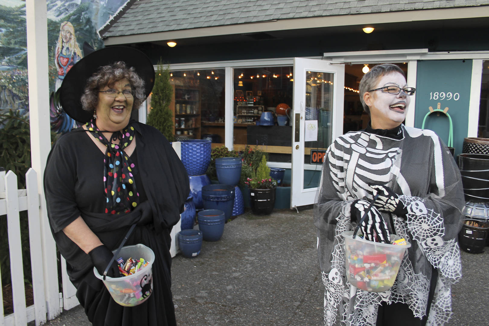 From left, Kathy Lens and Ruth Hartman await trick-or-treaters in front of Kathy’s Garden Stop and Floral Design, the former Hare & Hounds, Oct. 31. (Richard Walker/Kitsap News Group)