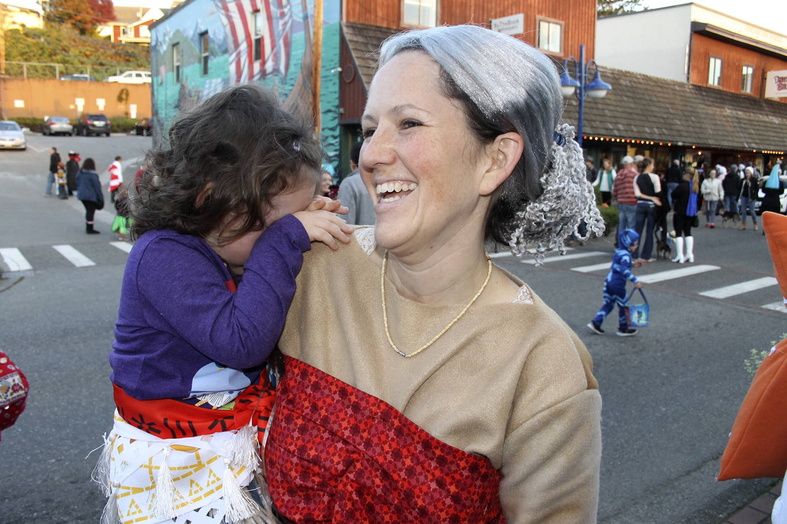 Left, Jodi Blackmore of Poulsbo laughs as her daughter Amelia, dressed as the lead character from the film “Moana,” gets camera shy, Oct. 31 in downtown Poulsbo. Right, Poulsbo Police Chief Dan Schoonmaker sports a police department patch in pink for Breast Cancer Awareness Month, and whiskers for “Movember,” a global effort to call attention to men’s health issues. Richard Walker/Kitsap News Group