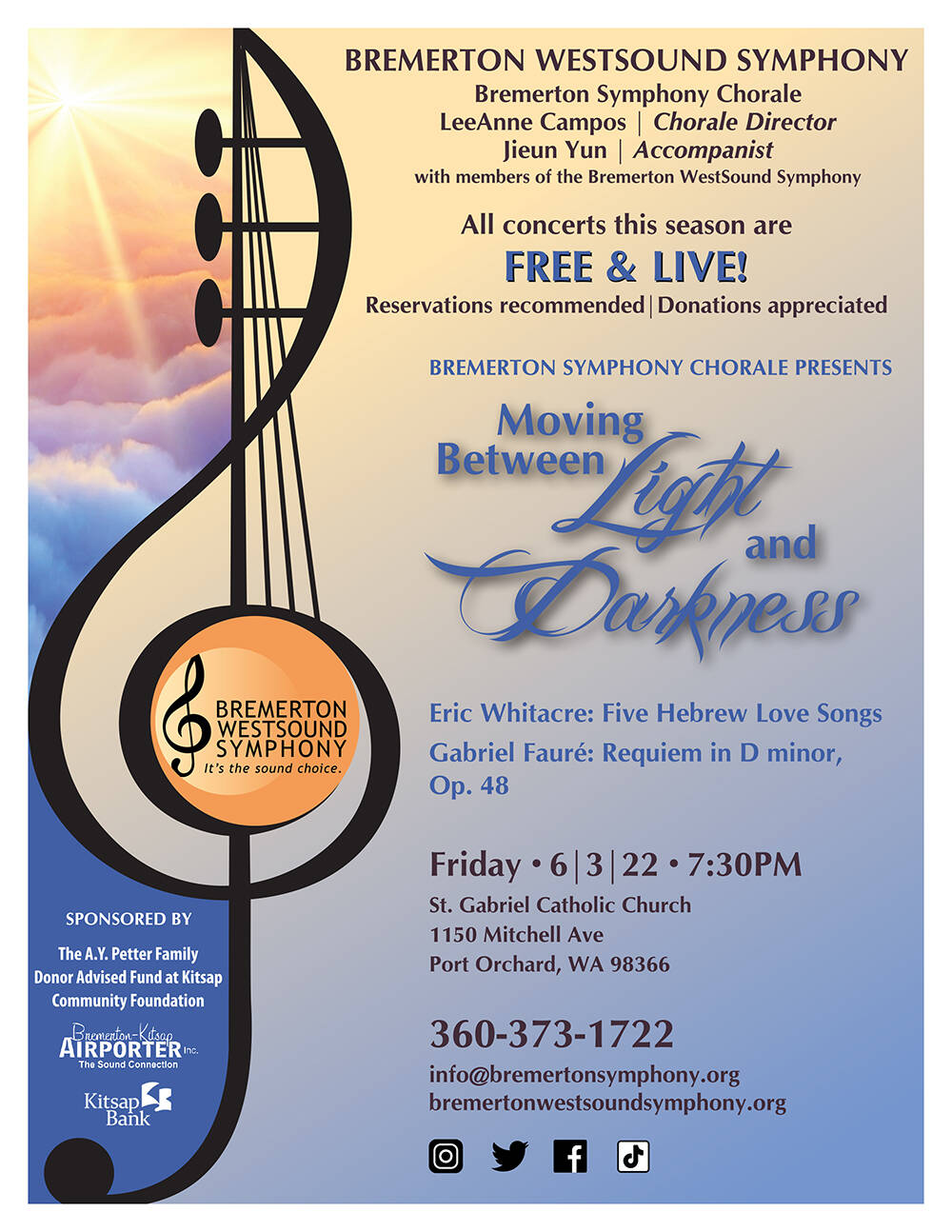 Bremerton Symphony Chorale presents: Moving Between Light & Darkness: 7:30 p.m. June 3 at St. Gabriel Catholic Church.