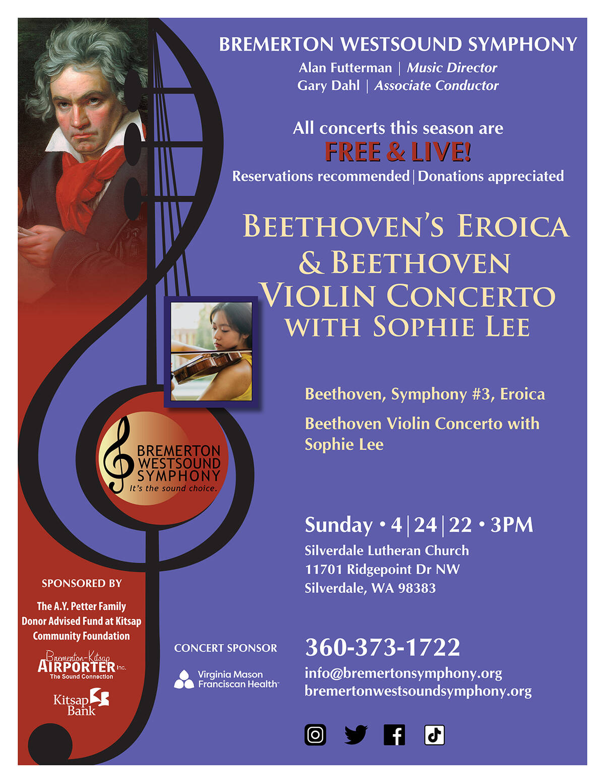 Call 360.373.1722 or email info@bremertonsymphony.org to reserve your FREE tickets to the Beethoven concert, happening Sunday, April 24 at 3 p.m at the Silverdale Lutheran Church. Learn more at bremertonwestsoundsymphony.org.