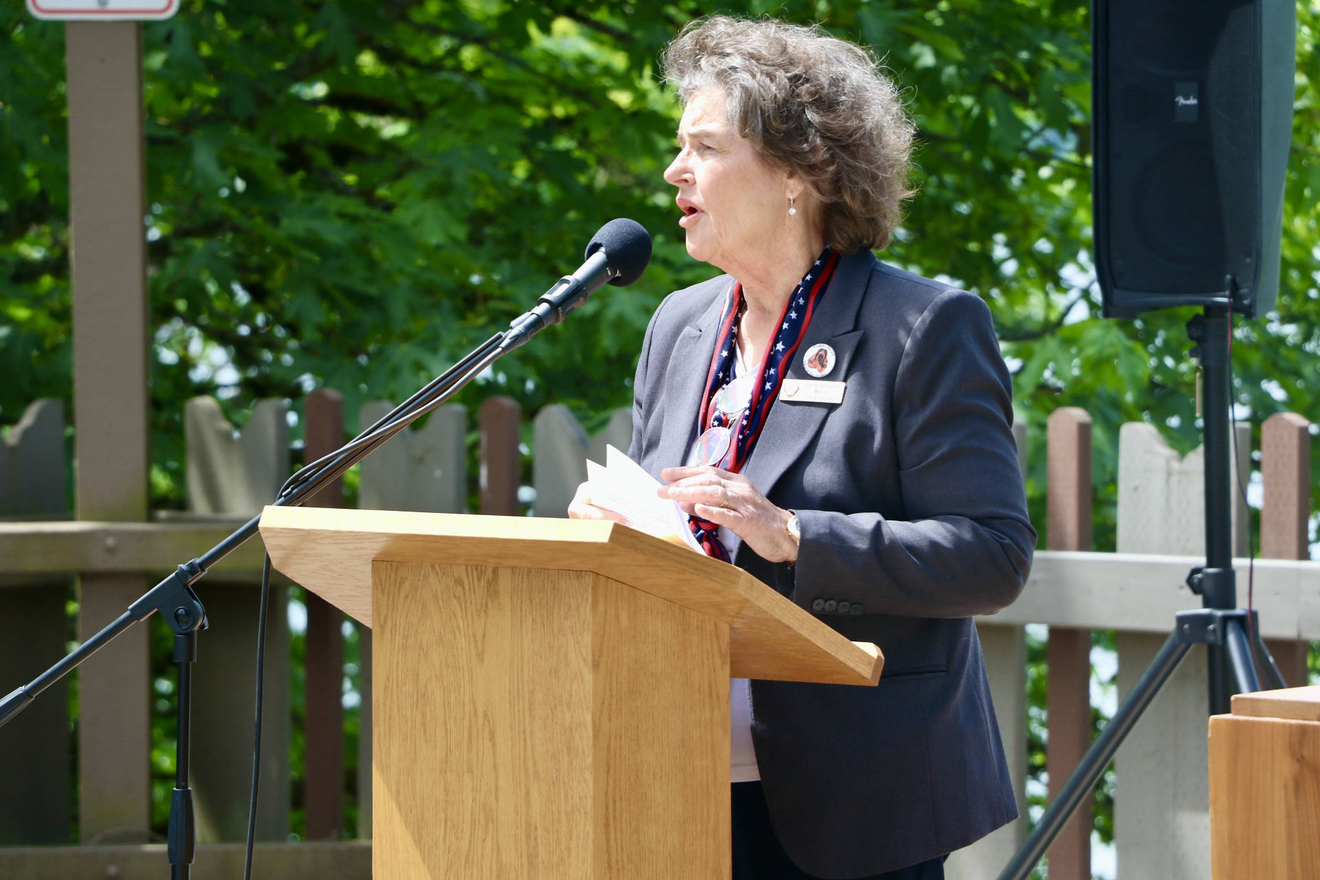 Poulsbo Mayor Becky Erickson spoke, recognizing its history and significance of the day, as well as noting that this was the first public ceremony she had spoken at in over a year because of COVID-19 pandemic restrictions.