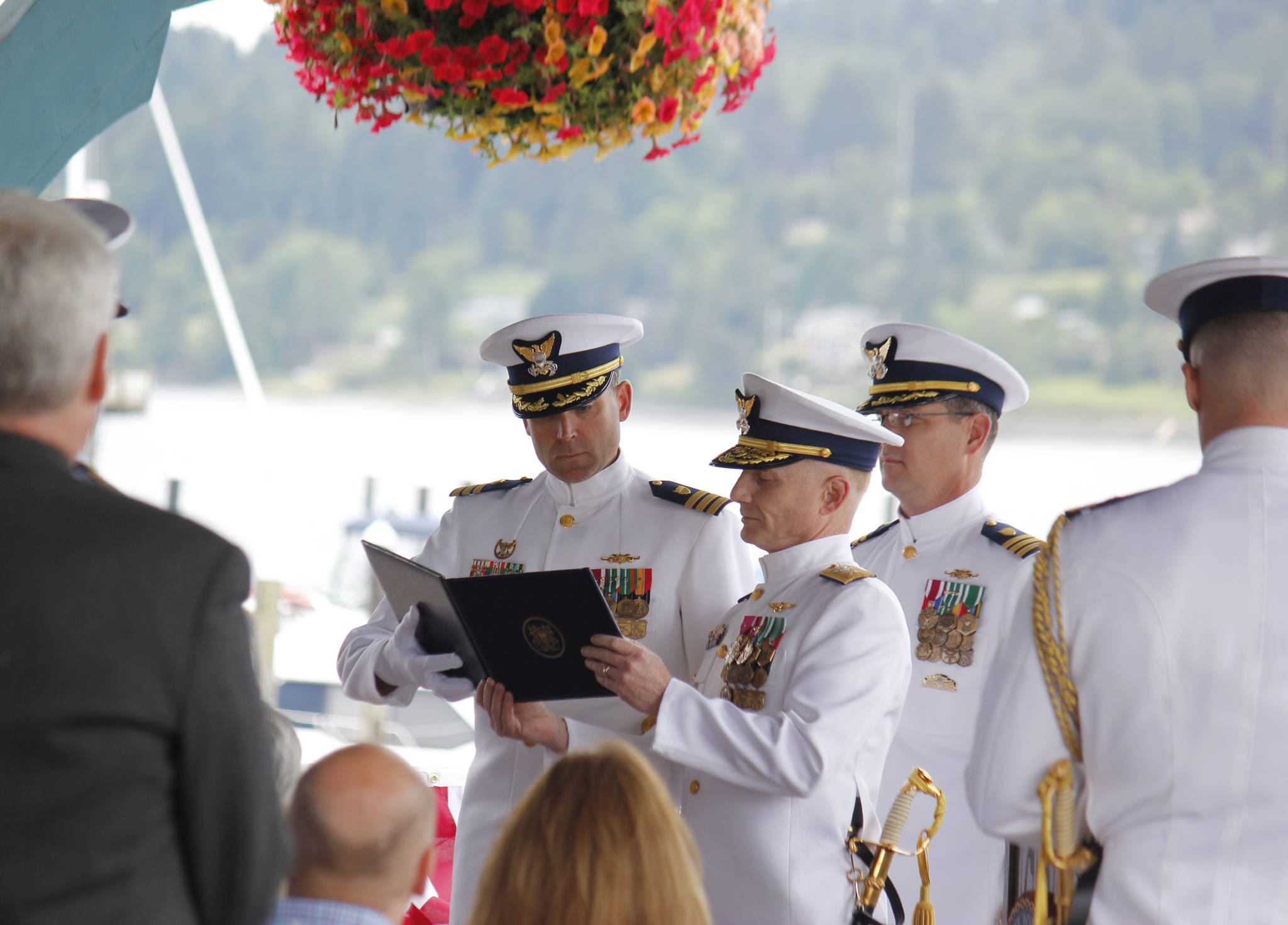 POULSBO — At 1300 hours June 28, the USCGC Sea Ray’s cannon boomed out 13 times across Liberty Bay, the hills across the bay echoing the reports back toward the 50 guests and several hundred enlisted and commissioned personnel gathered at the Austin-Kvelstad Pavilion in Muriel Iverson Williams Waterfront Park.