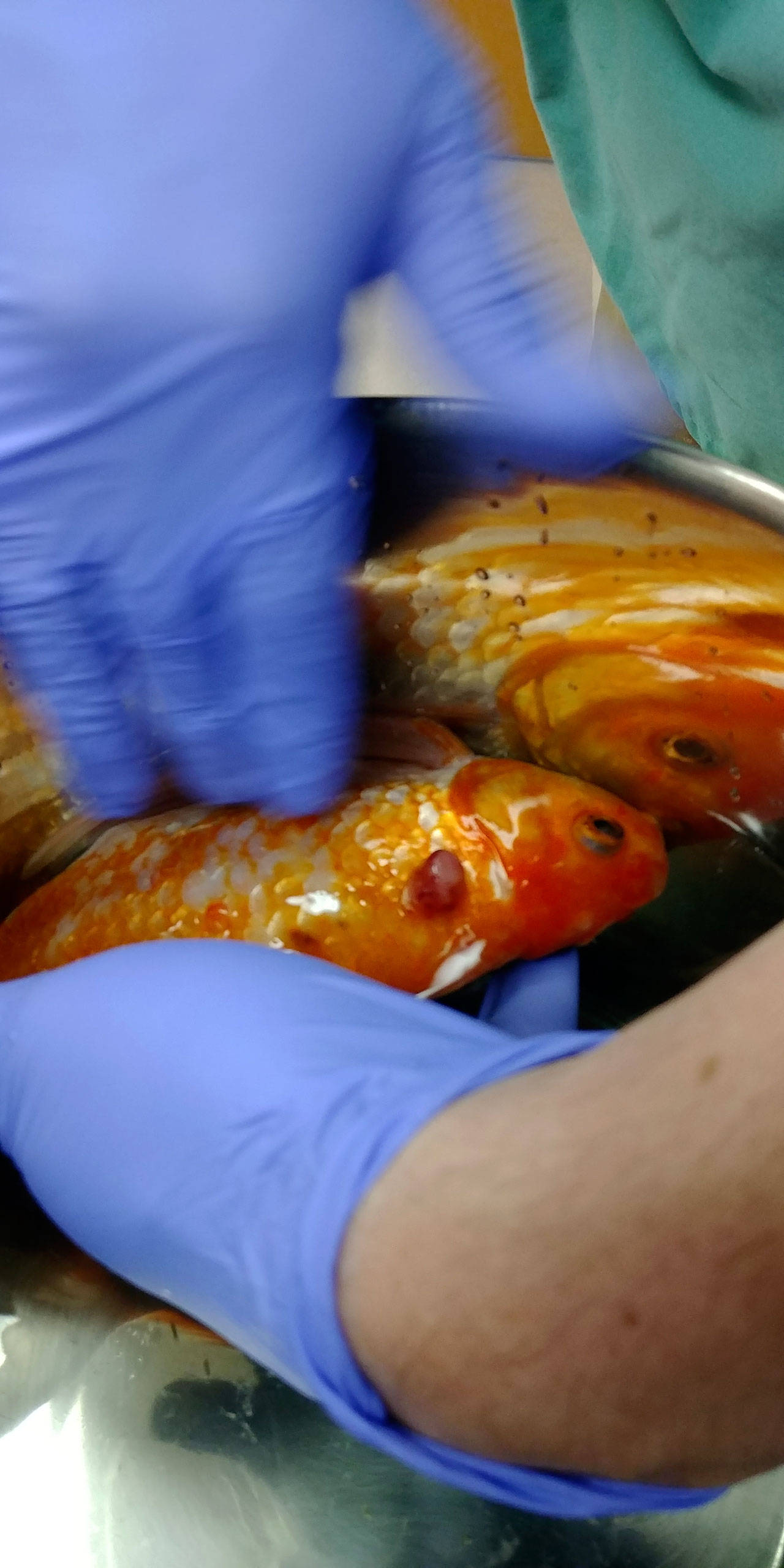 Dr. Craig Adams of Poulsbo Veterinary Clinic removed a tumor from Bubbles, a goldfish. (Courtesy photo)