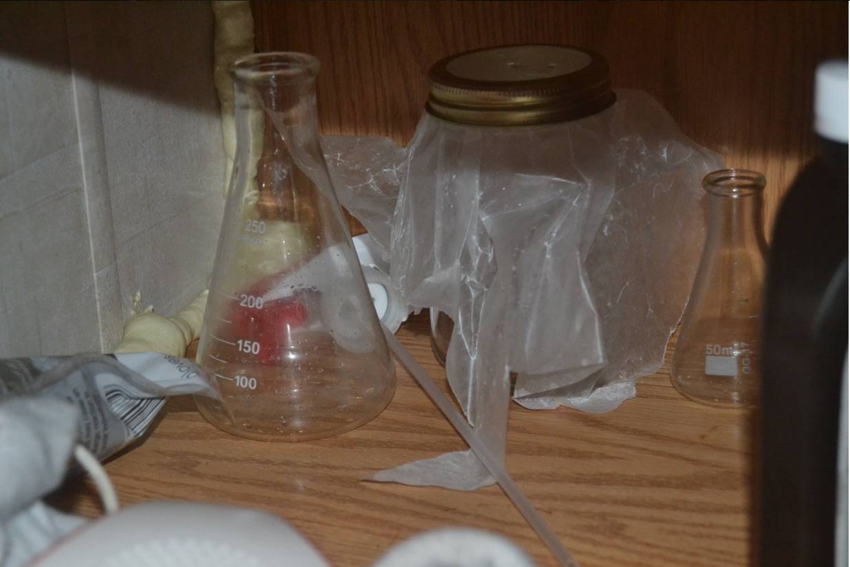 During the warrant service, detectives located evidence that indicated an active and functioning methamphetamine lab was in operation, to include glass meth sheets, meth manufacturing chemicals, chemistry beakers, Pyrex dishes, tubing materials and personal protective equipment. Also located were scales, drug packaging material and 6.5 cups of liquified meth.