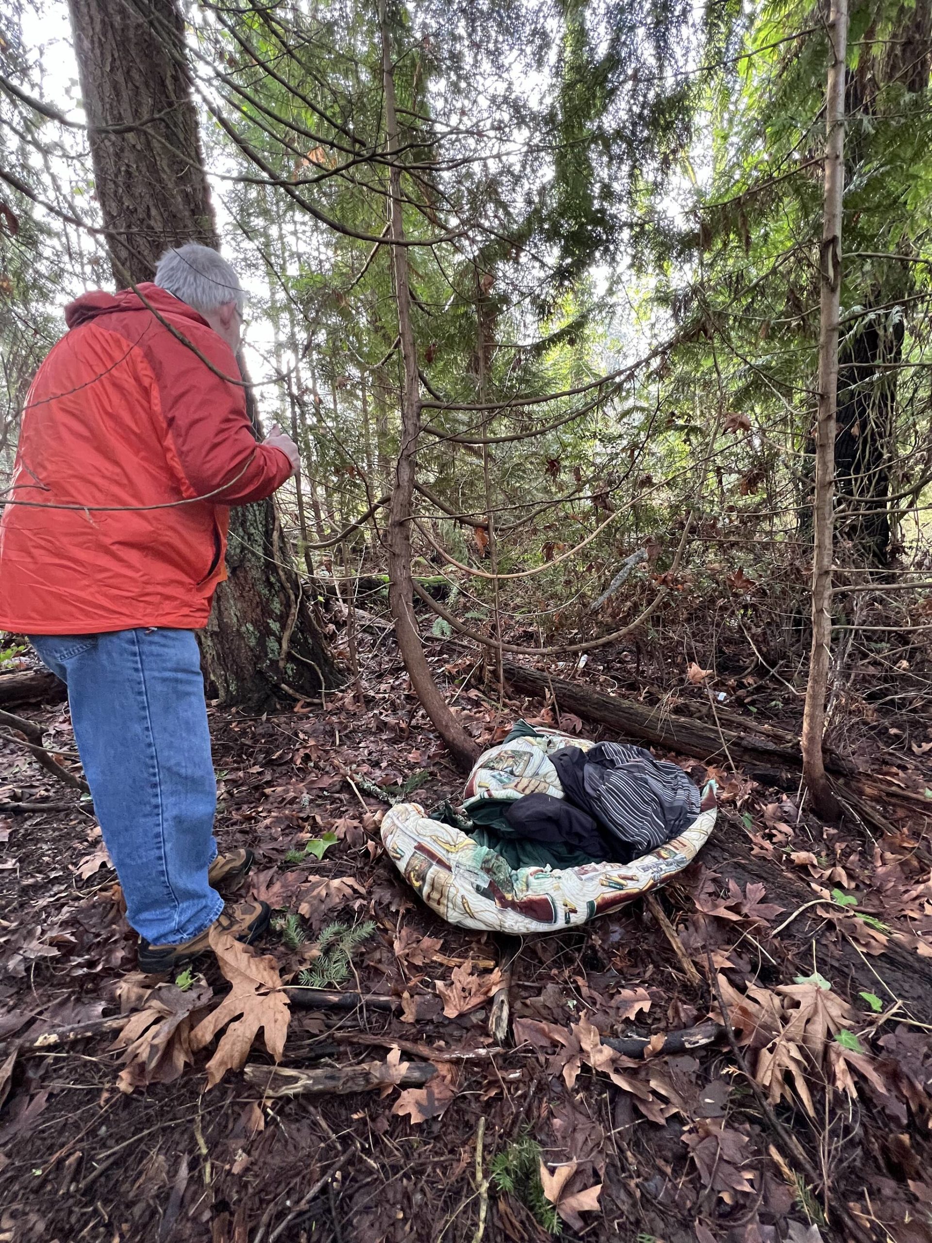 In Poulsbo, the duo searched the Urban Park Trail and found two unsheltered sleeping areas and one tidy encampment with a tent.