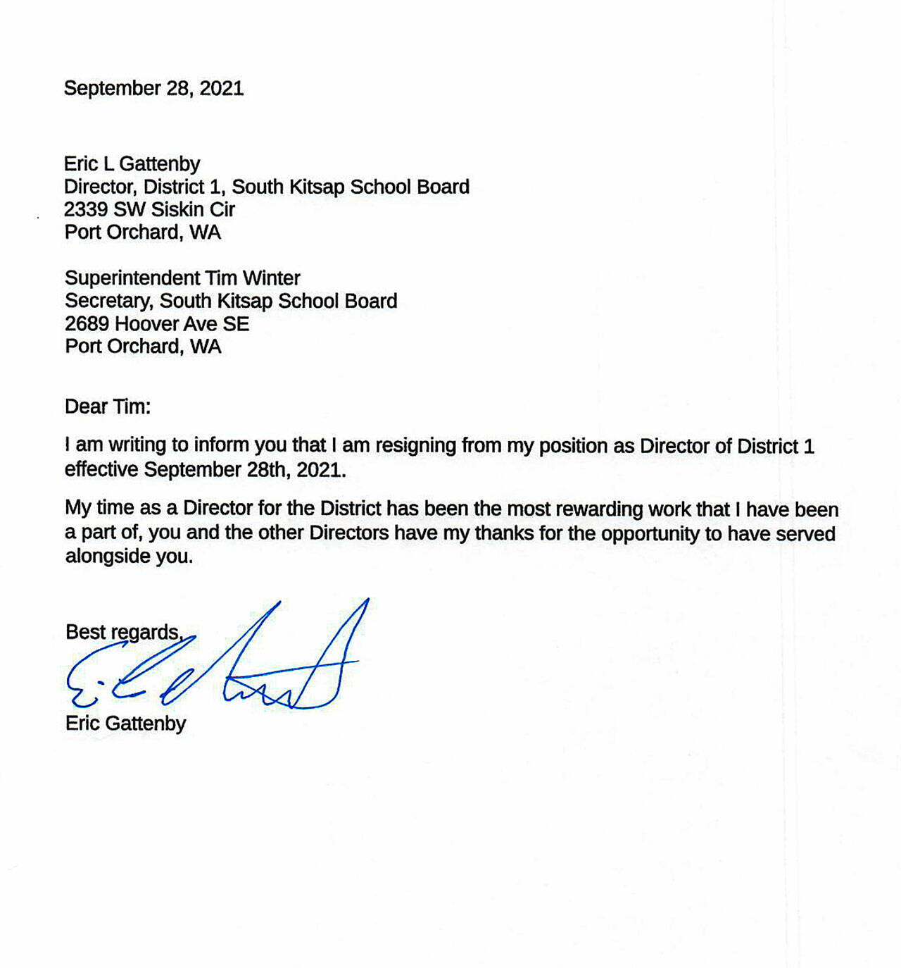 PORT ORCHARD – Eric Gattenby, president of the South Kitsap School District Board of Directors, submitted his resignation, effective immediately, in a Sept. 28 letter to Superintendent Tim Winter.
