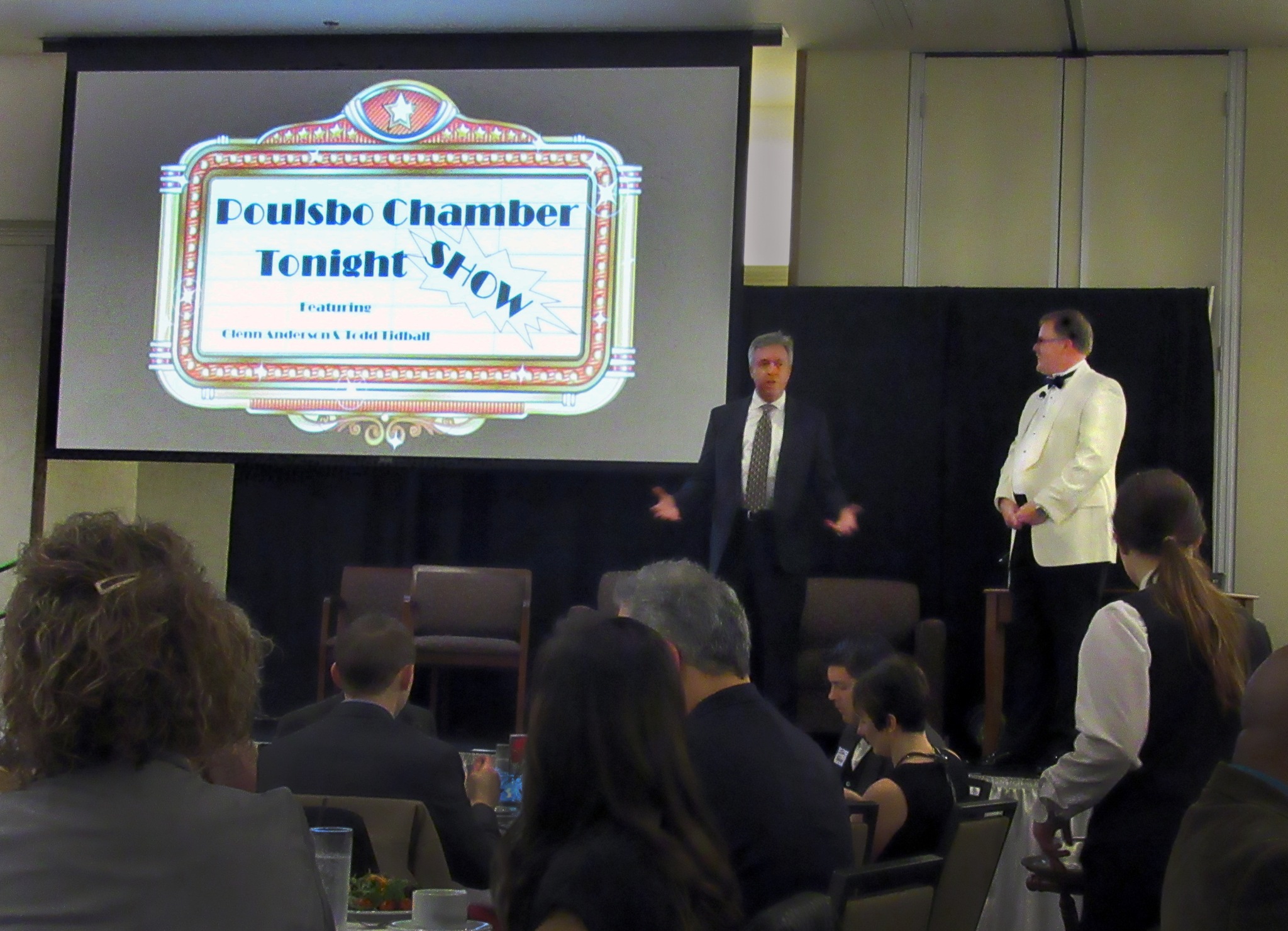 Besides a booming economy, much of the credit for the good mood goes to Glenn Anderson and Todd Tidball, whose “Poulsbo Chamber Tonight Show” format channeled Ed McMahon and Johnny Carson. They offered up “man on the street” videos (“How do you pronounce ‘Poulsbo’?”) and live bits that borrowed liberally from late-night talk shows.