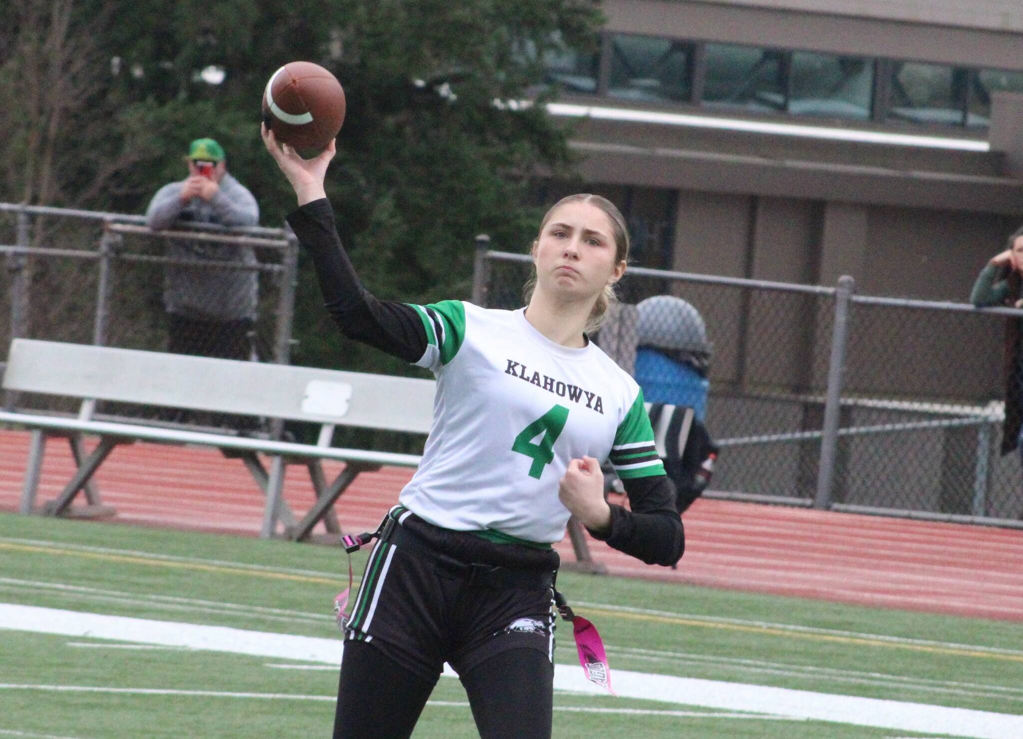 Eagle quarterback Leah Pearce throws a pass in Klahowya’s 35-21 win over Kingston in the West Central District 1A/2A girls flag football championship Jan. 31 at Integrity Roofing Stadium in Bremerton.
