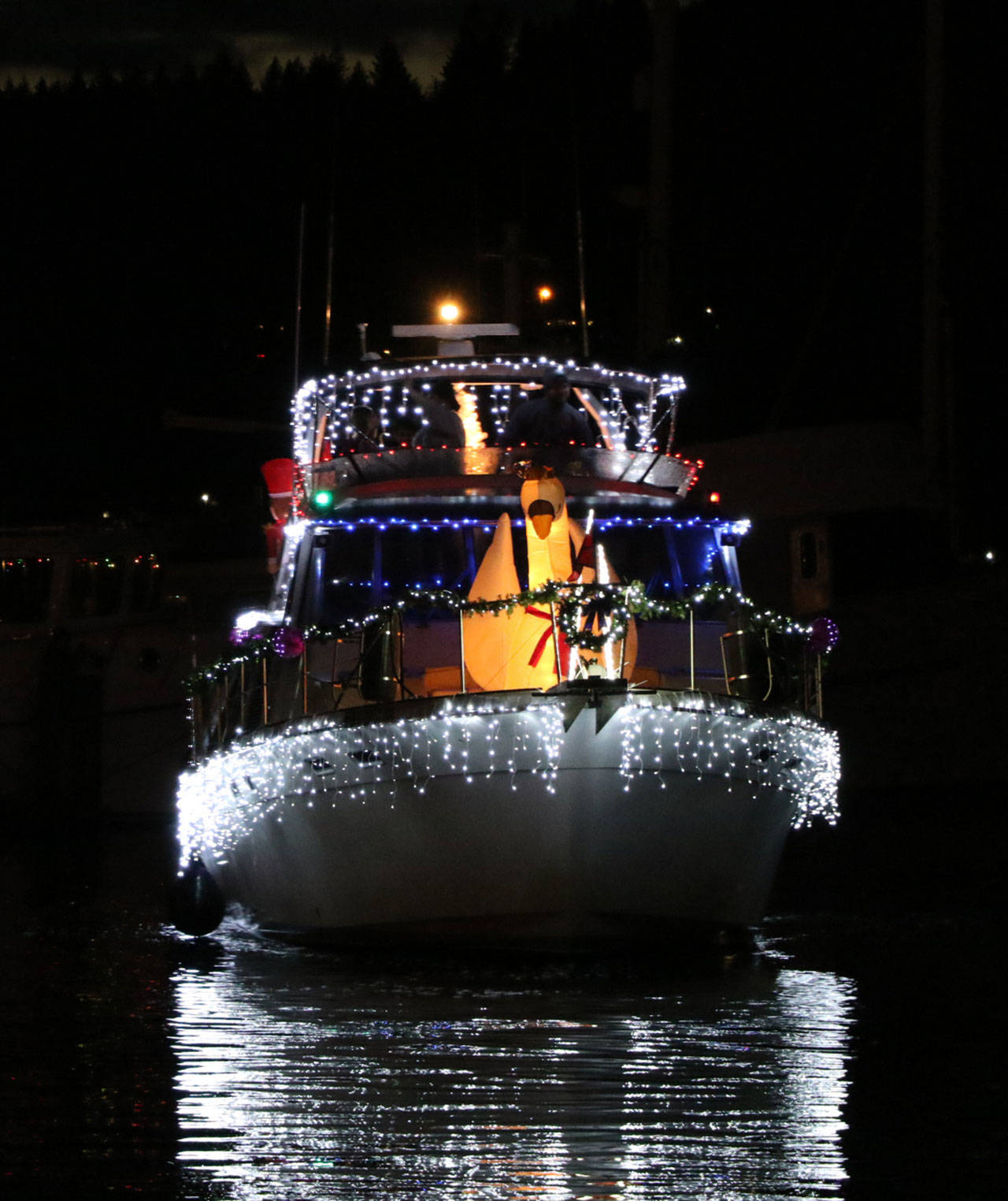 According the Poulsbo Yacht Club, Santa read out over 100 greetings throughout the night as the ships traveled nearly 21 nautical miles around the peninsula from Poulsbo to Bainbridge.