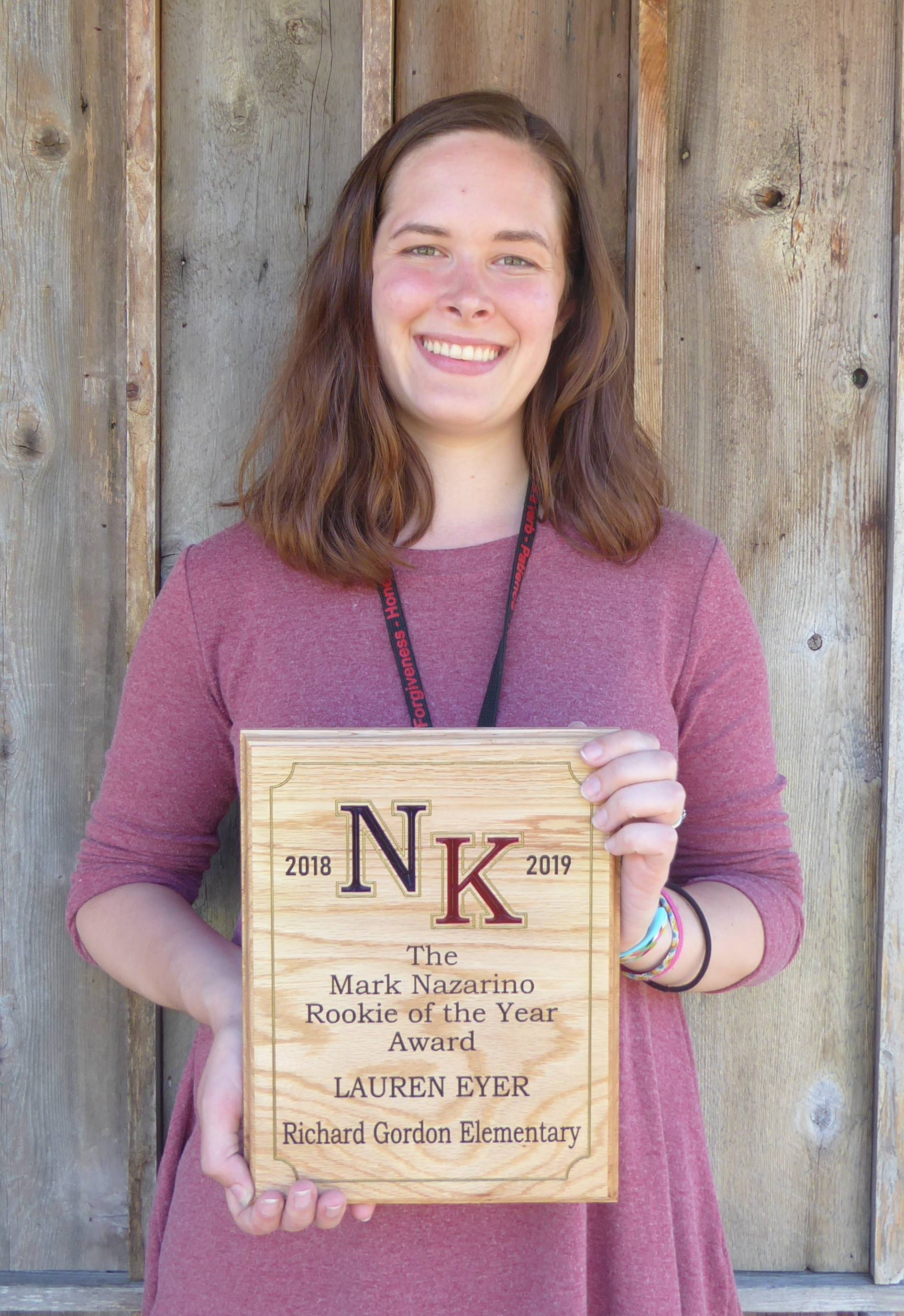 The 2019 Rookie of the Year award was given to Lauren Eyer, of Gordon Elementary, where she has been teaching kindergarten for nearly three years. According to Rogers, Eyer was described by her nominator as “’quiet and competent, thoughtful and thorough.’” The nominator also noted Eyer’s weekly newsletters she sends home, letting parents know what is going on in the classroom and advising of ways they can support their students at home.