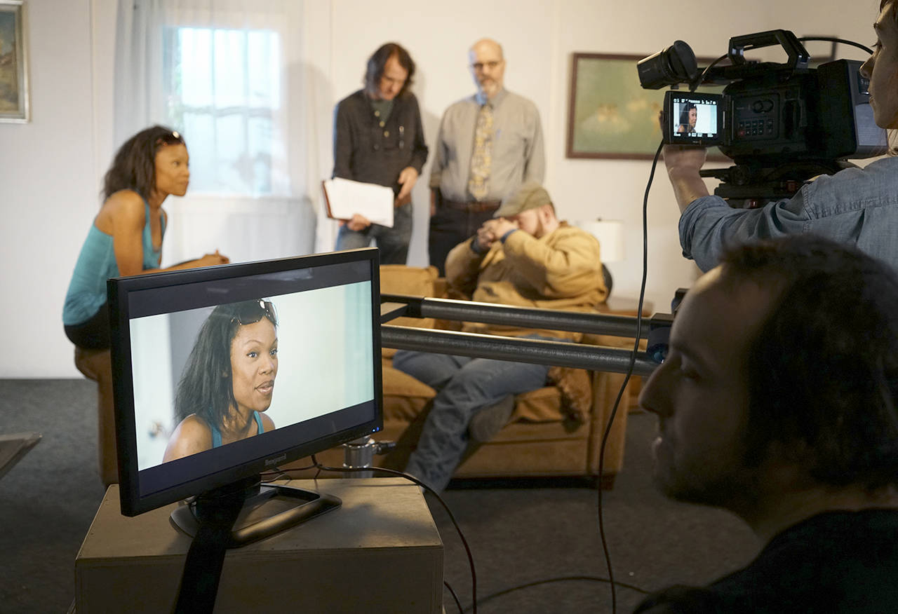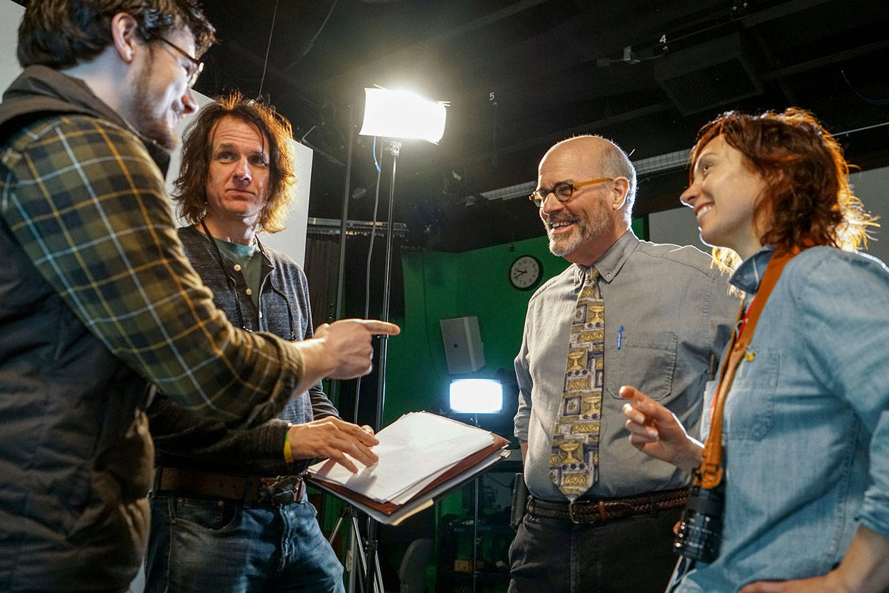 Faculty members discuss a scene with a student. From right, Amy Hesketh, professor of digital film making; Timothy Hagan, founder and director of the OC Film School; and Aaron Drane, professor of screenwriting.                                Olympic College/Contributed