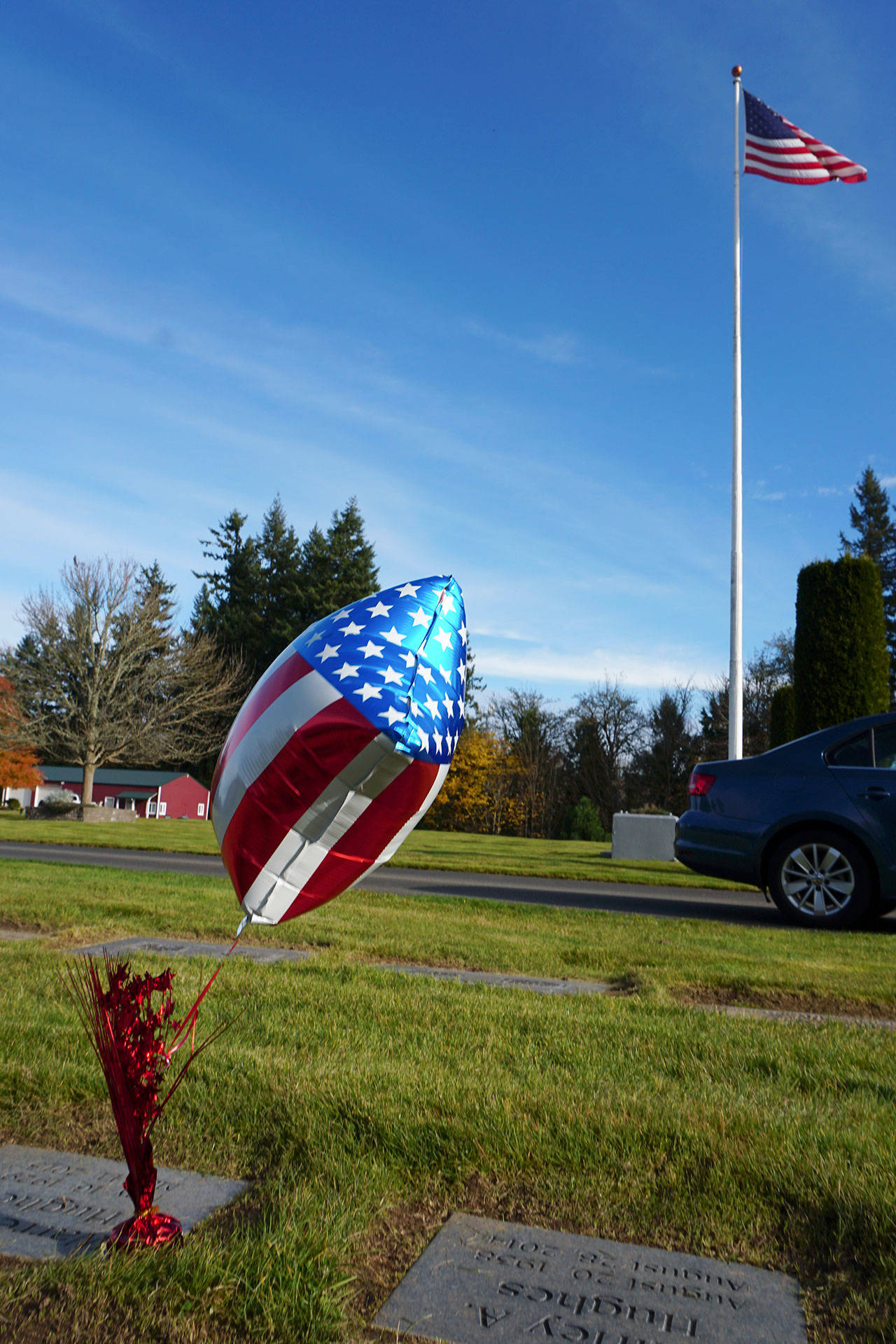 PORT ORCHARD — Cemeteries containing the remains of honored veterans — including Sunset Lane Memorial Park in Port Orchard — were visited by somber family members on this quiet Monday afternoon who left miniature flags and small stars-and-stripes-adorned balloons next to the plaques and monuments of their loved ones who served the nation at some point of their lives.