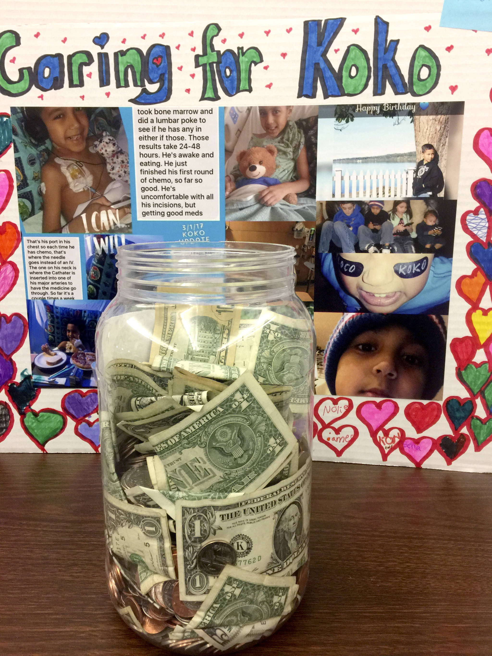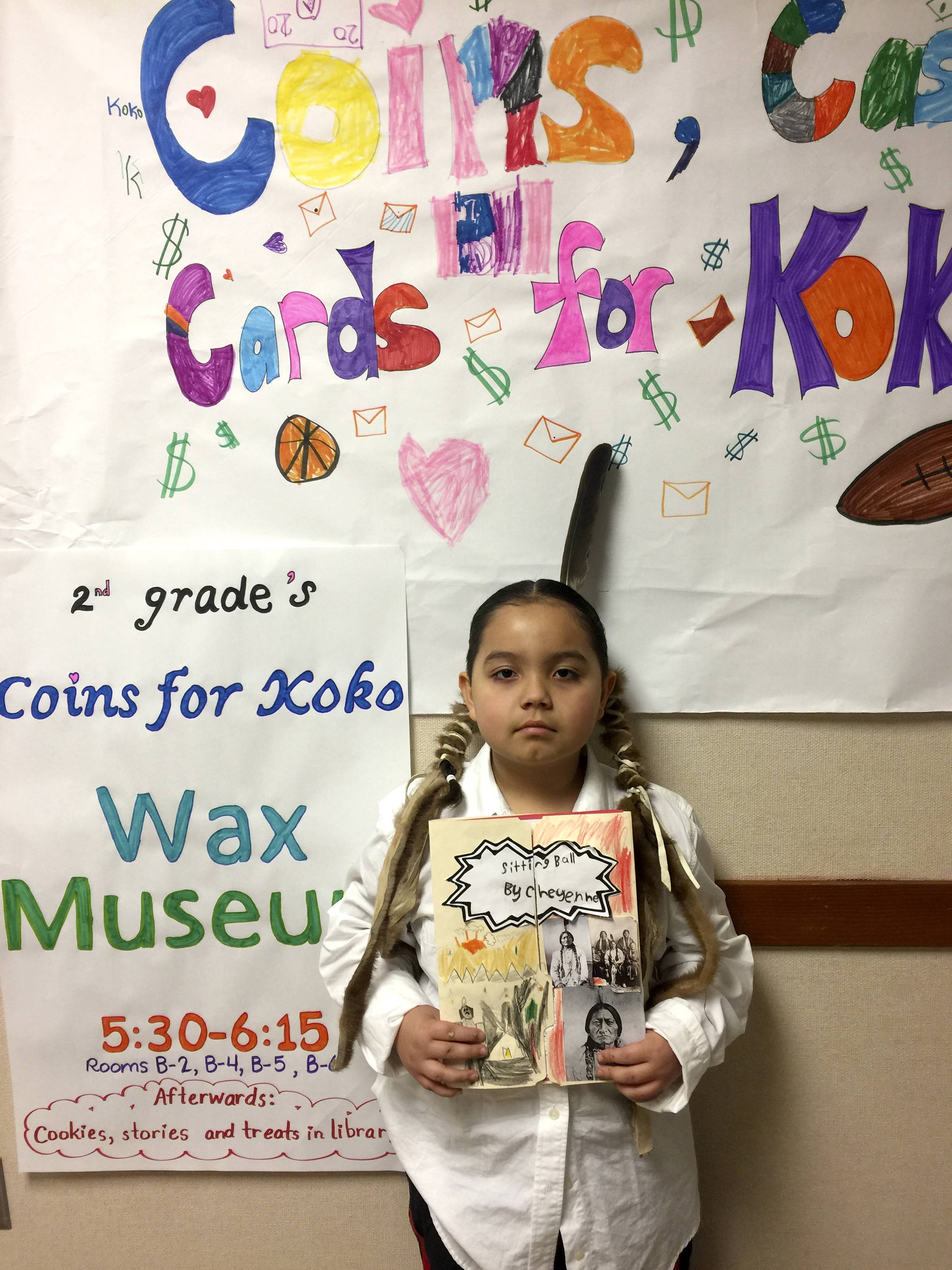 Garrett’s class of 18 kids began collecting coins for Koko before their wax museum event. Just by emptying their own piggy banks into a jar in their class, they raised more than $500.