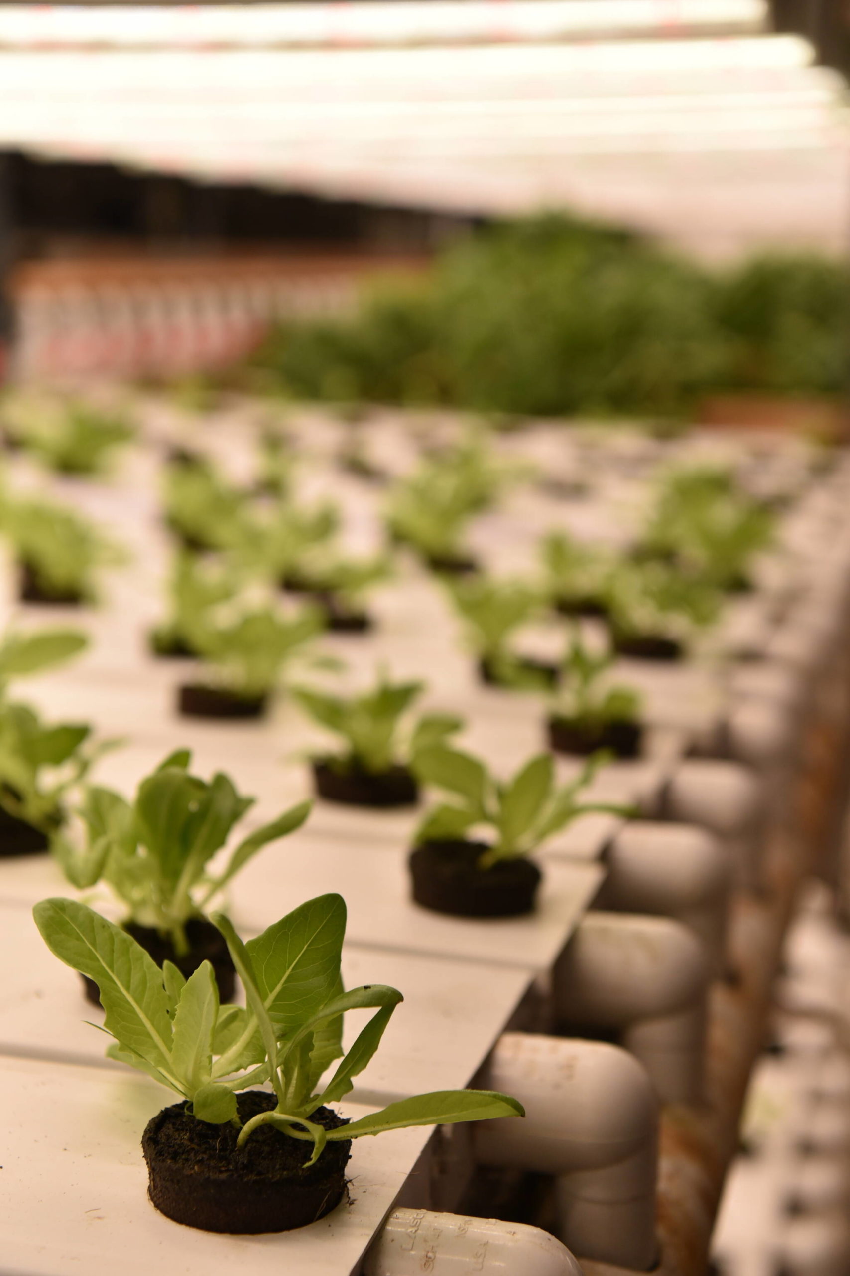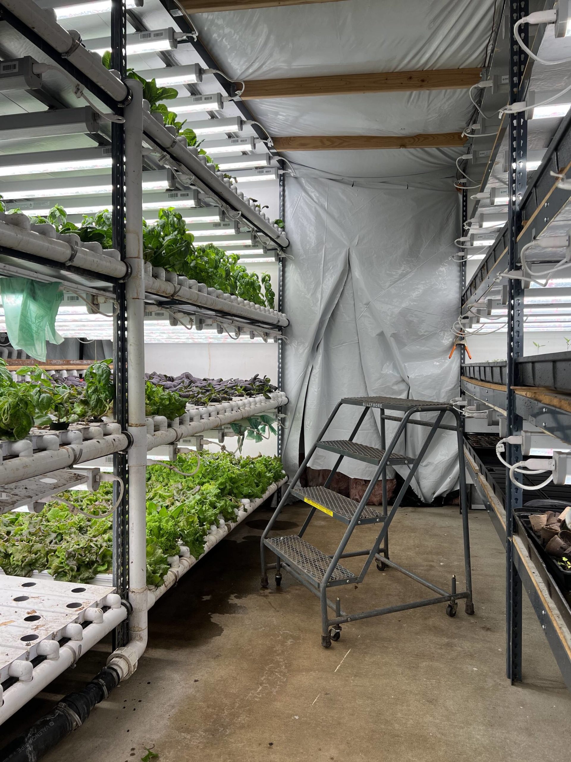 Inside the hydroponics shed, the grow racks resemble stacks found in a data center. White PVC tubes hold the plant starts that are in little pots illuminated by suspended grow lights as water can be heard running through the system.