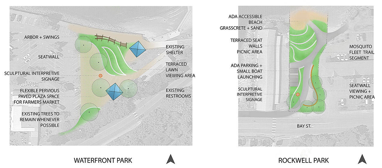 Russell presented preliminary design concepts to the City Council during its March 21 work study session at City Hall. Labeled the Mosquito Fleet Park Concept, two pocket parks under design will sit on the waterfront — Waterfront Park will be placed near the gazebo, and the other, Rockwell Park, will front Bay Street and sit in between the Marlee Apartments and the Comfort Inn motel.