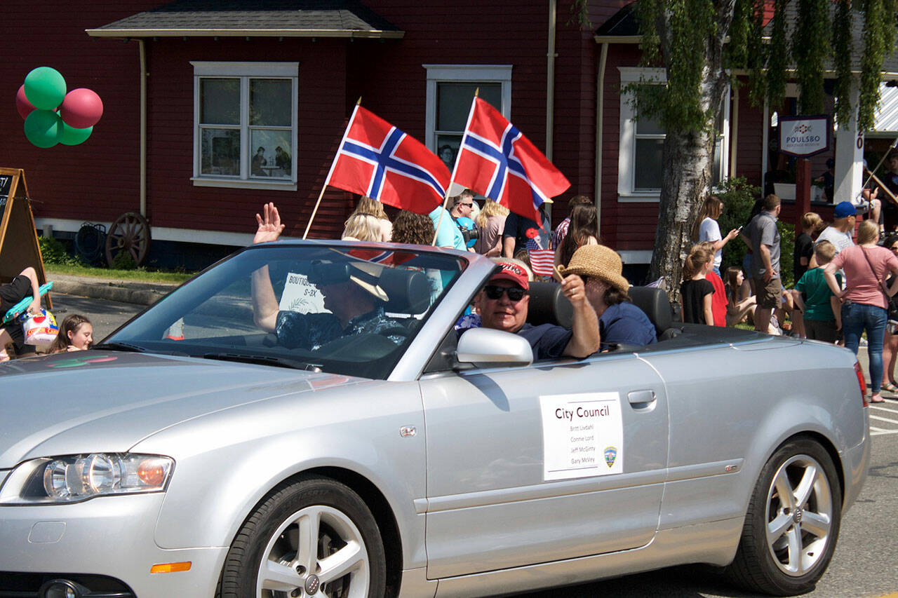 Poulsbo city councilmembers greet the crowd during the Viking Fest parade.