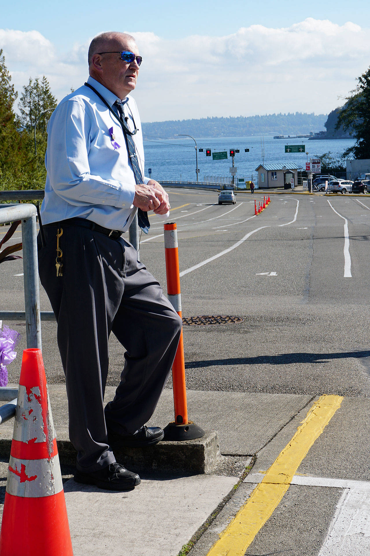Phil Olwell, Southworth Ferry Terminal supervisor, and WSF Director of Operations Greg Faust spoke movingly of Phillips’ spirit and generosity during the ceremony. The toll booths were decorated with balloons, flowers and decorated signs — festooned in purple, her favorite color — that spoke of the woman’s sunny personality and her love of this region’s sports teams. Washington State Patrol troopers also were on hand to honor the late state employee.