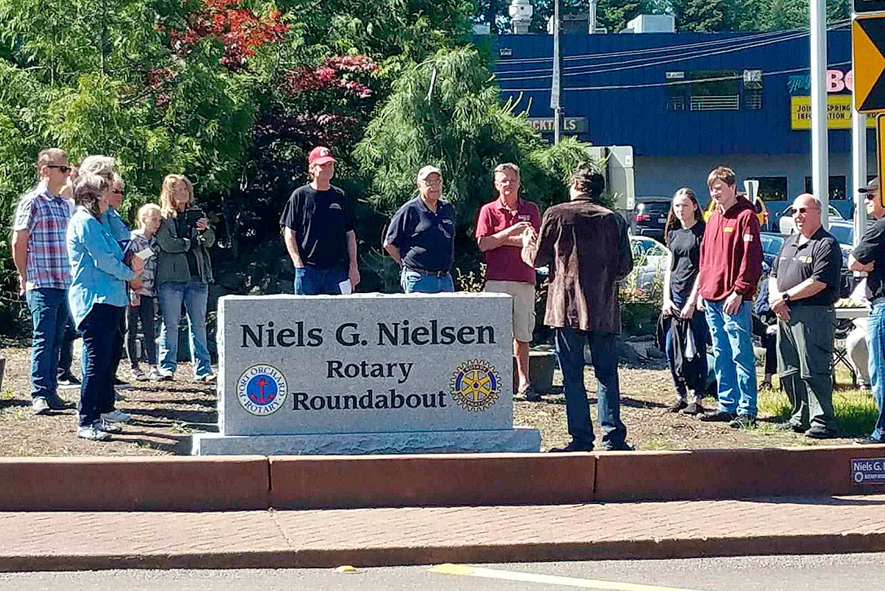 PORT ORCHARD — Members of the Port Orchard Rotary Club gathered on Saturday, June 2, to dedicate the roundabout at the intersection of Bethel Avenue and Mile Hill Drive in honor of Niels Nielsen, a world-renowned Rotarian from Denmark.