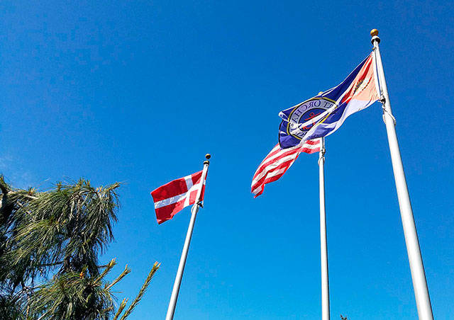 In honor of Nielsen’s heritage, Rotary’s Mark Grimm said Denmark’s flag was hoisted during the roundabout’s dedication to fly alongside the City of Port Orchard flag and his adopted and much-loved country’s — America — flag. But the handsome stone monument was the focus of the dedication ceremony.