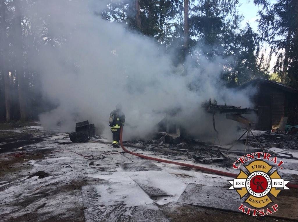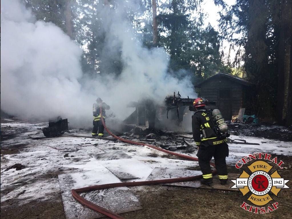At 5:21 p.m., Central Kitsap Fire & Rescue responded to the fire in the 10000 block of NW Pioneer Road. The trailer was approximately 20 feet from a garage and 100 feet from a residence, but the fire was contained to the RV, according to CKF&R Public Information Officer Ileana LiMarzi.