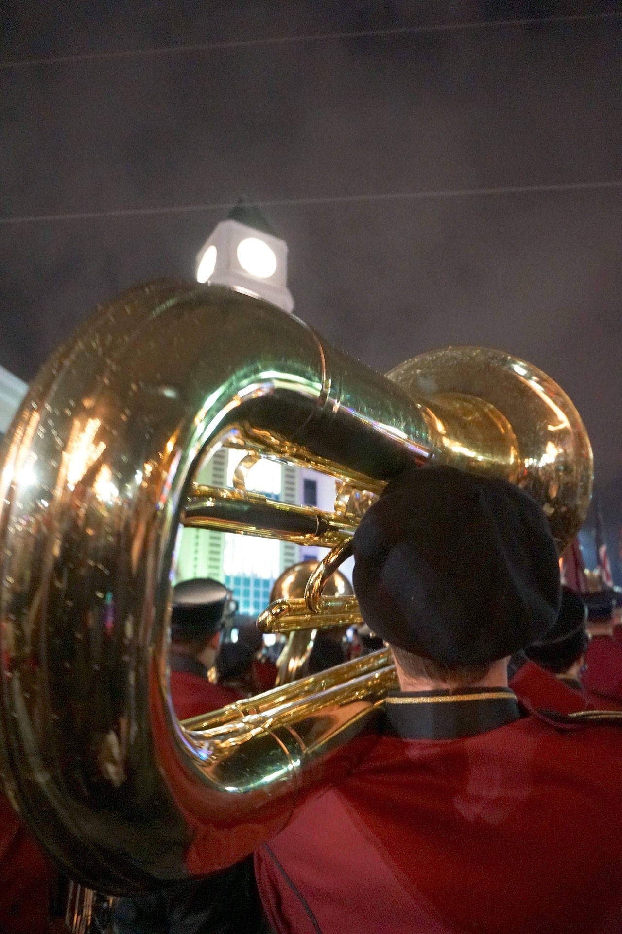 Jolly Old St. Nick was led along Bay Street into downtown by the South Kitsap High School Marching Band, who members were dressed like wooden marching toy soldiers dabbed in face paint and wearing traditional maroon-colored outfits.
