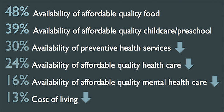 COMMUNITY DESIGN: Respondents like their own neighborhood at 95%, but overall neighborhoods, commercial and residential planning received approvals in the high-30 percentiles. Public spaces got a 76%, with housing options at 23% and affordable housing a miserable 7%.